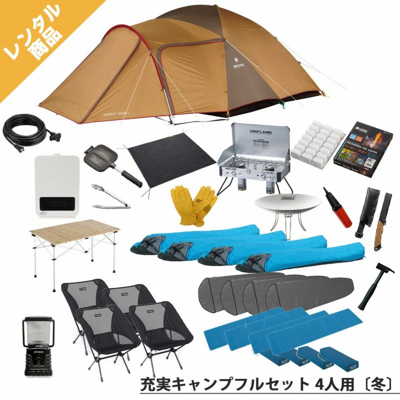 【10月早期予約】充実キャンプフルセット 4人用〔冬〕テント・テーブル・チェア・キャンプマット・シュラフ・マット・ランタン・グランドシート・焚き火台・ヒーターなど【キャンプレンタル】 WF4
