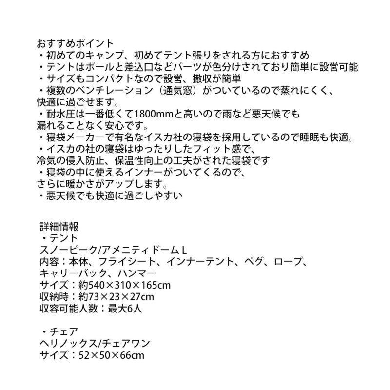 ・サイズもコンパクトなので設営、撤収が簡単 ・複数のベンチレーション(通気窓)がついているので蒸れにくく、快適に過ごせます。 ・耐水圧は一番低くて1800mmと高いので雨など悪天候でも漏れることなく安心です。 ・寝袋メーカーで有名なイスカ社の寝袋を採用しているので睡眠も快適。