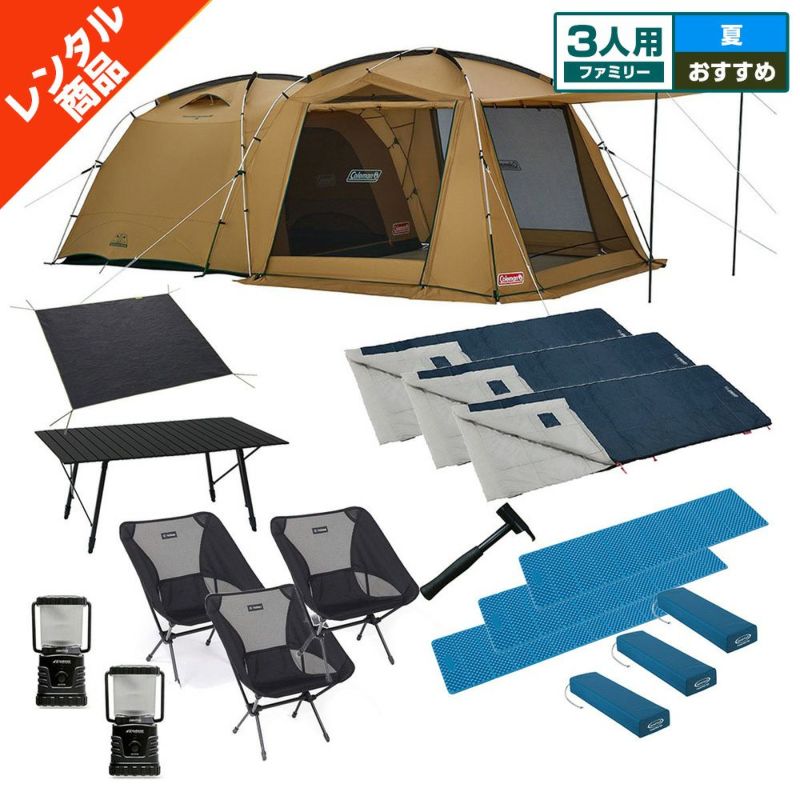 【11月早期予約】【キャンプレンタル】ファミリーキャンプセット 3人用〔夏〕テント・テーブル・チェア・キャンプマット・シュラフ・ランタン・グランドシート 暑い夏におすすめSUT4