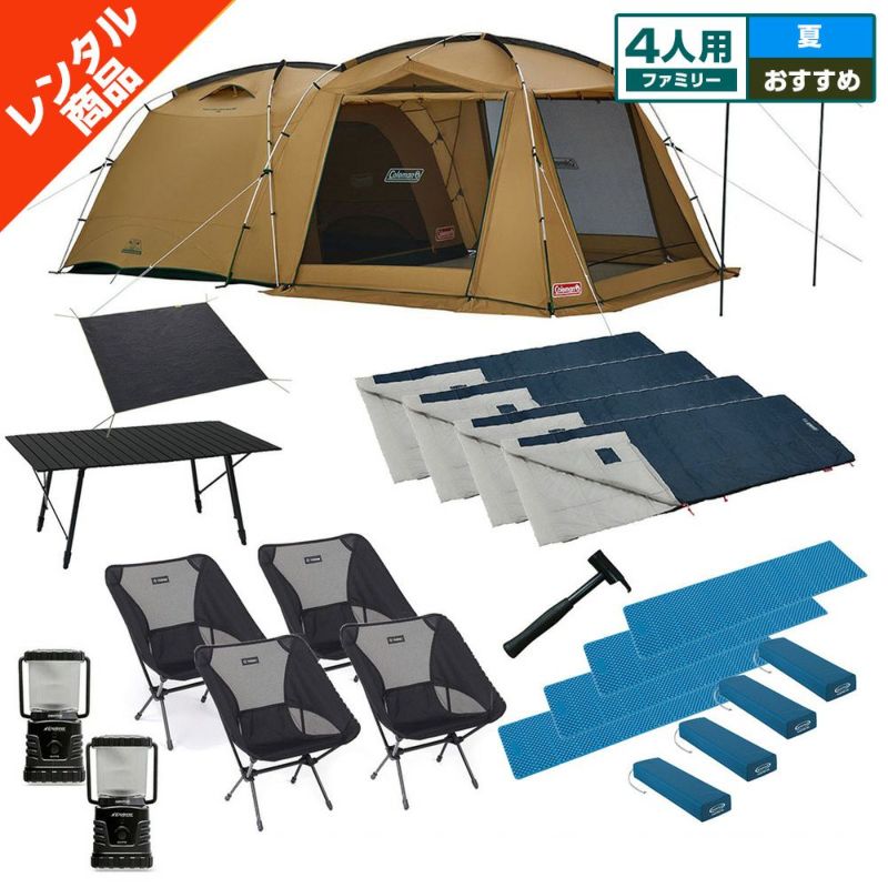 【12月早期予約】【キャンプレンタル】ファミリーキャンプセット 4人用〔夏〕テント・テーブル・チェア・キャンプマット・シュラフ・ランタン・グランドシート 暑い夏におすすめSUF4