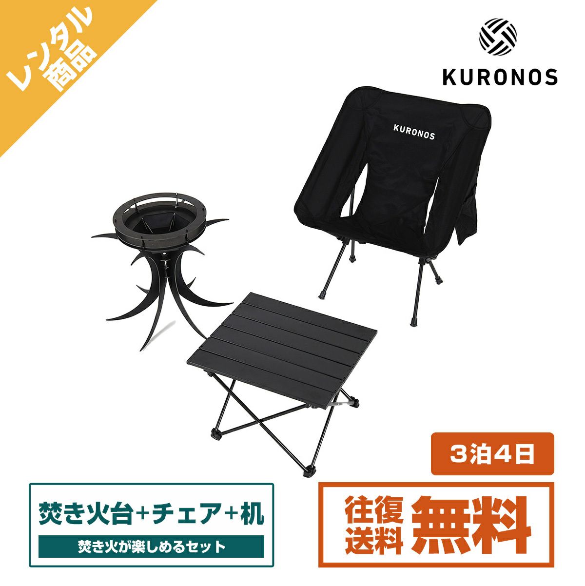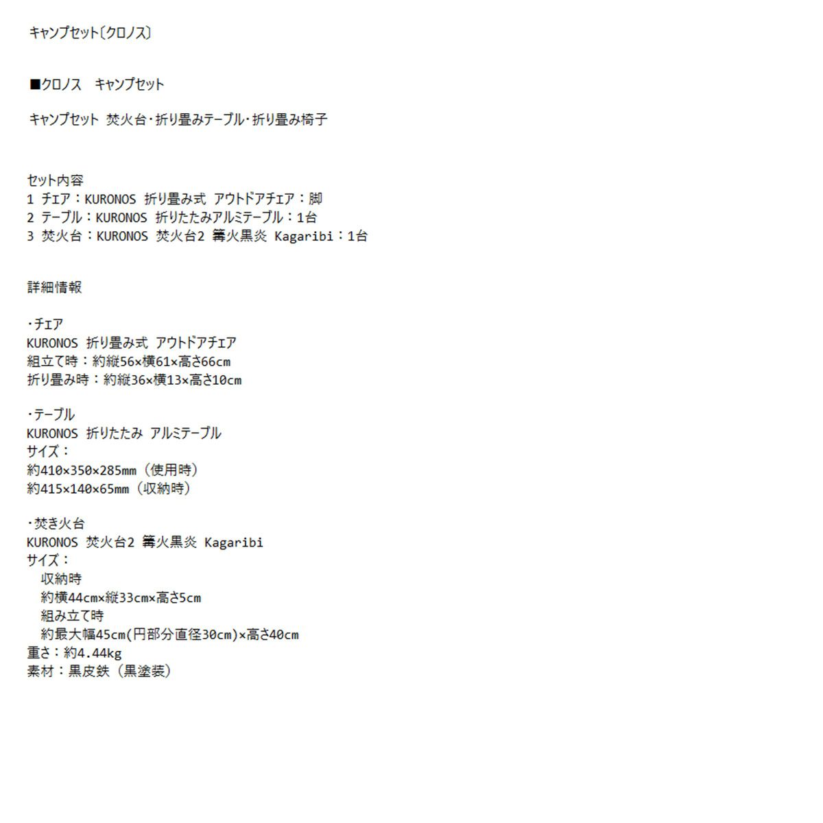 他の画像を見る おしゃれにソロキャン!クロノス ソロキャンプセット! 【キャンプレンタル】KURONOS クロノス キャンプセット 焚火台・折り畳みテーブル・折り畳み椅子TP41 春秋 夏 冬 定価 オープン価格 ¥ 5,490 税込 在庫切れ